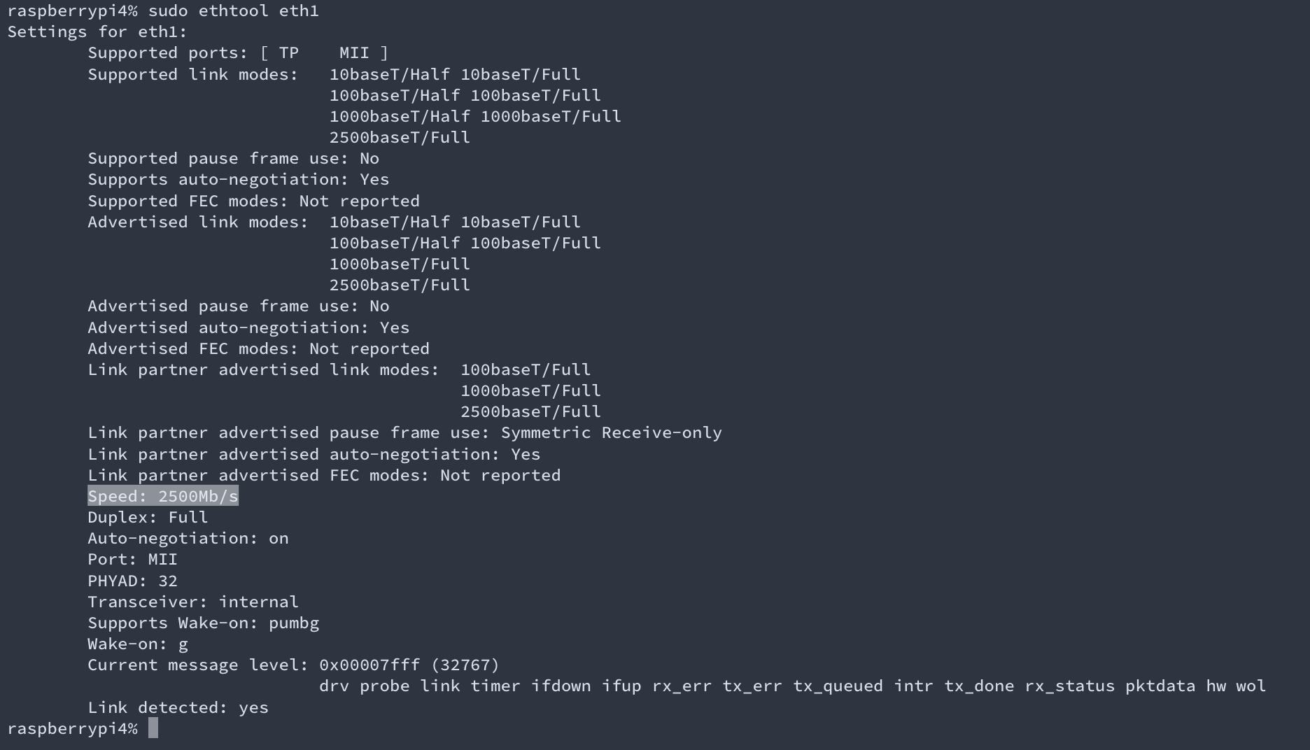 raspberrypi4% sudo ethtool eth1 | grep Speed